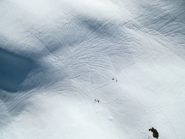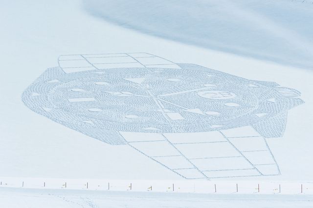 Seine Methode funktioniert so: Er entwirft die Motive in seinem Haus in den französischen Alpen. Dann berechnet er die Größe so, dass jeder Millimeter seiner Zeichnung genau einem Schritt entspricht. Mit einem Kompass läuft er dann die Form ab, zählt die Schritte und setzt kleine Stöcke als Markierung. Kreise zieht er mit einer langen Schnur, wie ein menschlicher Zirkel. So lässt Beck Muster entstehen, die von oben betrachtet so präzise aussehen, als hätte eine Maschine sie in die Landschaft gefräst. Rund acht Stunden braucht er für so ein Motiv, das oft so groß ist wie mehrere Fußballfelder – etwa dreißig Kilometer legt er dabei zurück. Manche Linien stapft er mit seinen Schneeschuhen mehrfach ab, damit die Striche dicker werden. »Man braucht eigentlich nur passende Kleidung und einen hervorragenden Orientierungssinn«, sagt Beck, der sich selbst einen »Schneekünstler« nennt. Warum tut er das?