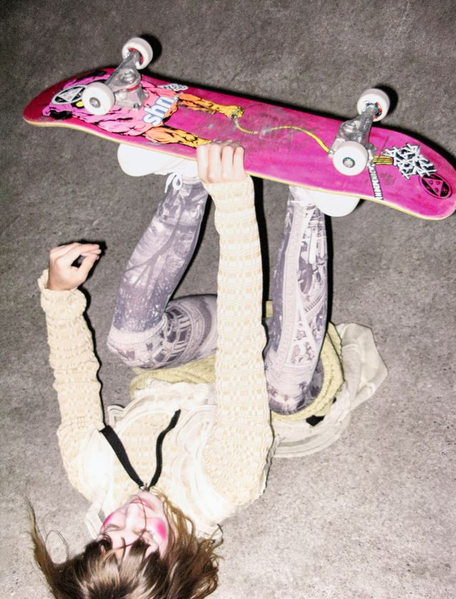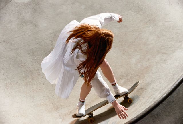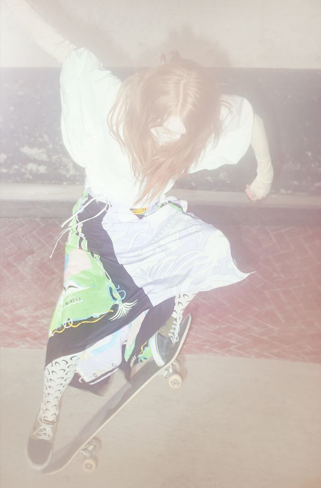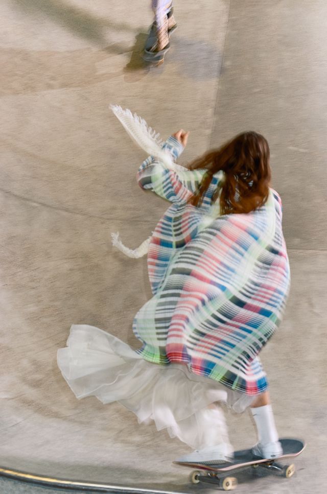 Was für ein großer Auftritt das wäre, wenn Lea Schairer in diesem blauen Gucci-Fransenkleid, wild geschminkte Wangen noch dazu, über den olympischen Skateboardpark in Tokio rollen würde. Oder, wie auf Bild 7, im weißen Spitzenkleid von Alexander McQueen. Der Anlass wäre feierlich genug: Im Juli 2020 nehmen zum ersten Mal SkateboardfahrerInnen an den Olympischen Spielen teil.
