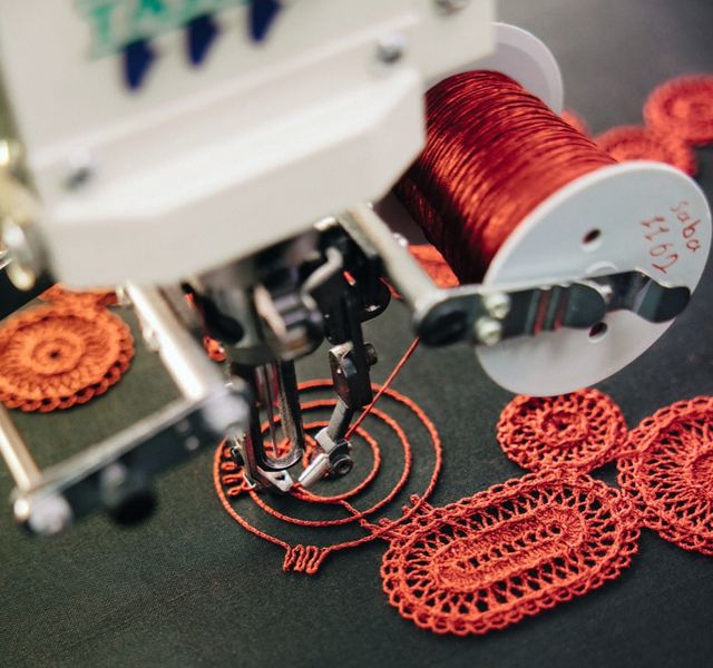 Sie beugen die Köpfe tief über den Arbeitstisch. Da liegen neben einer Stickmaschine gehäkelte Kreise, bestickt mit schwarzen Puscheln. Barbara Ludwig, die Stickerin, greift aus einer Plastikbox ein Büschel weißer Seidenfäden, drückt es mit ihren Fingerkuppen zusammen und stickt es ebenfalls auf einen gehäkelten Kreis, zwischen zwei schwarze Puschel. So entsteht eine Abfolge aus schwarzen und weißen Puscheln. Der Auftrag kommt von einem französischen Modehaus. Die bestickten Kreise sollen dessen Kleidungsstücke schmücken. »Daran arbeitet gerade fast das ganze Haus«, sagt