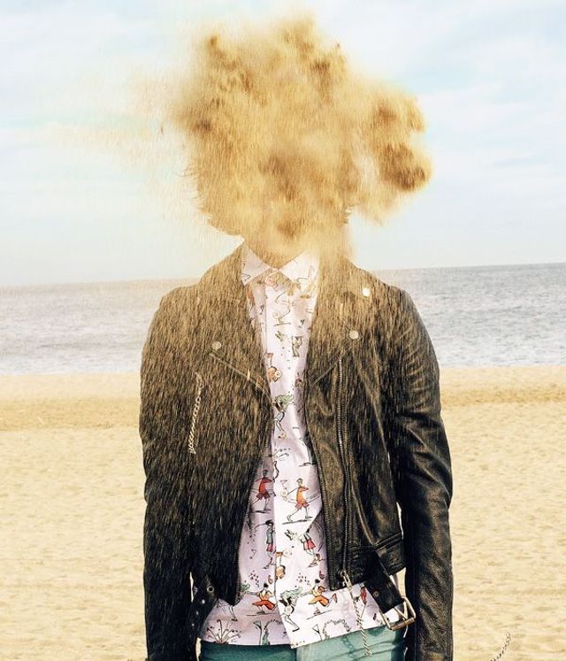 Das Comic-Hemd macht mich so verrückt, dass ich den Sand in den Kopf stecke! Hemd: Prada, Lederjacke: Maison Martin Margiela.