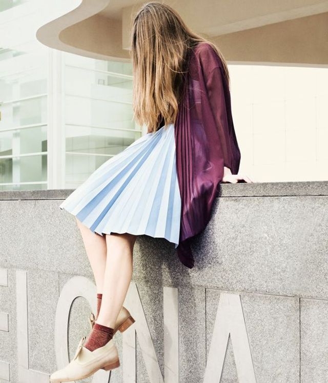 Sie lässt den Kopf nicht hängen, sie träumt von noch mehr Plisseefalten. Seidencardigan und Lederrock von Prada, Schuhe: Henrik Vibskov, Socken: American Apparel.