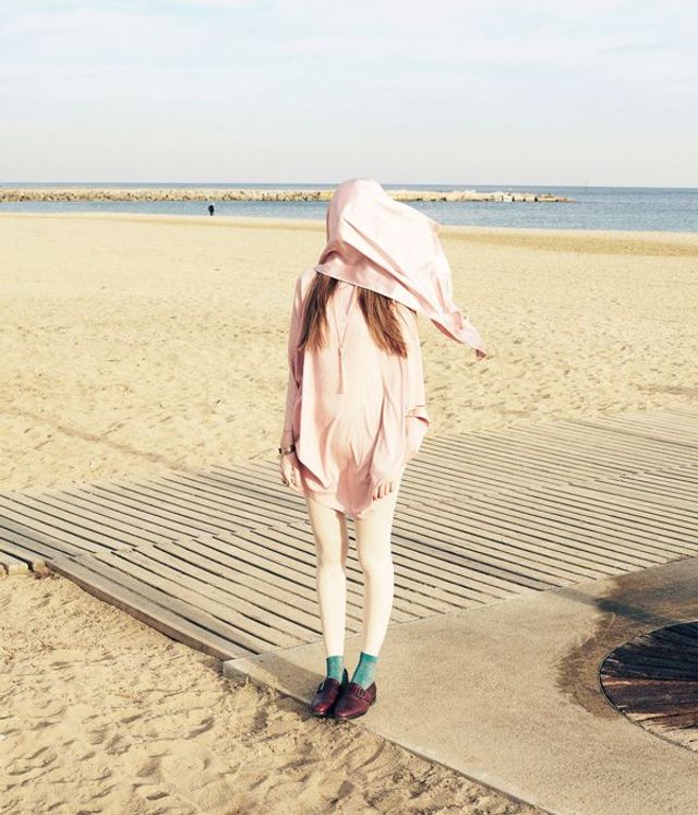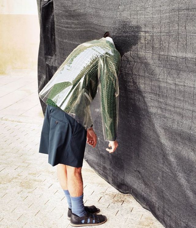 Nur in diesem Outfit kann man mit dem Kopf durch die Wand! Pullover, transparenter Blazer, Hose: Jil Sander, Socken: Henrik Vibskov, Sandalen: Camper.