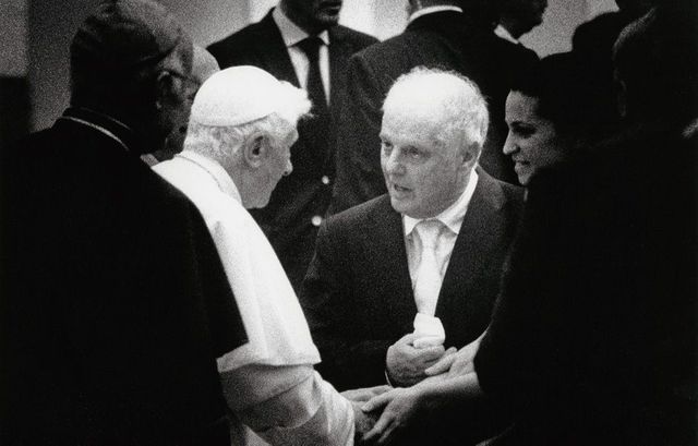 »Eigentlich«, sagt er, »gibt es nur zwei Dinge, die ich an Menschen bewundere: moralische Integrität und schöpferisches Genie.« Seine Helden sind Richard von Weizsäcker, Joschka Fischer, Felipe González, Frank Gehry, sein bester Freund ist der indische Dirigent Zubin Mehta. Eine Heldin ist nicht dabei. Der Papst auch nicht. Dafür ist seine Frau umso begeisterter. Sie ist ihm heute Morgen hinterhergeflogen, gestern hat sie selbst noch ein Konzert in Düsseldorf gespielt. Jetzt scrollt sie sich durch die Fotos auf ihrem Mobiltelefon: Sie und ihr Mann, eingerahmt von zwei Schweizer Gardisten: »Toll, oder?«, schwärmt sie.