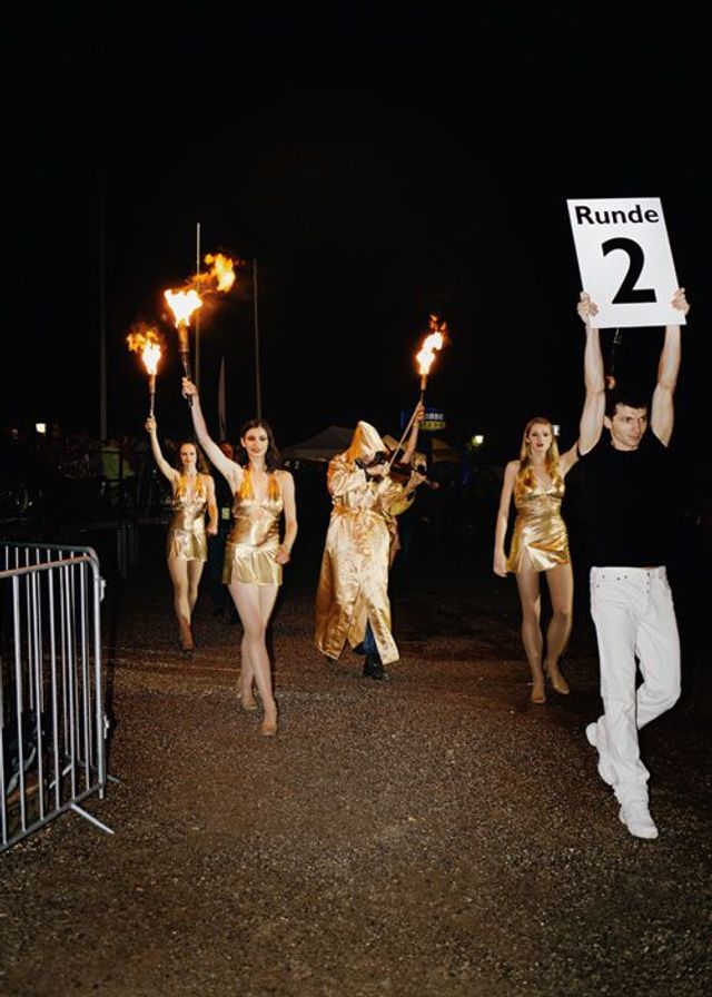 Das Programm beginnt mit We Will Rock You von Queen, das mit seinen gestampften Synkopen seit 36 Jahren Menschmengen jeder Größe in Einpeitscherlaune bringt. Es folgen Coldplay, Schwanensee, AC/DC, Beethoven, Bizet. In der Pause versammelt sich der Tross im Backstagebereich, einem Camp aus mobilen Baubaracken. In Davids Baracke darf nur eine schmale Dame mit blondem Haar, seine Mutter, die ehemalige Ballerina Dove-Marie Garrett.