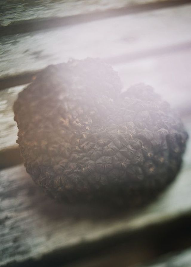 Nichtstun lag ihm aber weniger als gedacht. Er wollte eine sinnvolle Beschäftigung, hörte von einem wilden Trüffelsucher und meldete Winnie den Hund und sich selbst bei dem Mann zur Ausbildung an. Pilze hatten ihn schon lange fasziniert, wenn auch bis dahin nur die überirdischen. Trüffeln riechen intensiv erdig-animalisch und haben ein Aroma wie nichts sonst im Waldboden, nur deshalb funktioniert das Suchspiel mit Hund oder Schwein. In dem Kurs war sein Hund der schlechteste, sie fanden nichts. Spaß machte es trotzdem. »Du machst etwas mit deinem Tier, das ist tausendmal besser, als immer nur so Gassi zu gehen. Da ist eine Interaktion Mensch, Tier, Natur.« Sie übten immer weiter, monatelang, mit einer Übungstrüffel vom Feinkost. Am 3. Januar 2013 legte Winnie im Wald zum ersten Mal sacht die Vorderpfote auf eine bestimmte Stelle. Zwei Zentimeter darunter war eine Burgundertrüffel, von der Christian Gold inzwischen sagt, dass sie häufiger vorkommt als Steinpilz oder Pfifferling. An jenem Winternachmittag aber war es die beste Trüffel der Welt.
