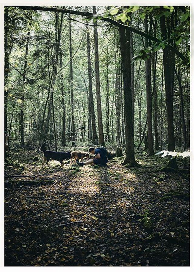 Zurück im Wald. Milano scharrt mit beiden Pfoten zwischen altem Laub, direkt darunter kommen drei kleine Kugeln zum Vorschein. Christian Gold beugt sich lange darüber, dann stellt er den Rucksack ab, holt die große Kamera und das winzige Stativ heraus und murmelt: »Sternsporige Laubtrüffeln. Und zwar sehr schöne.« Er bittet die Hunde höflich, ihm kurz aus dem Licht zu gehen.