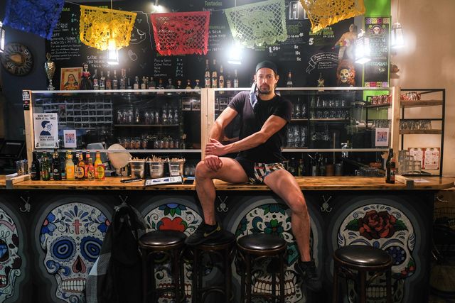 Ich wollte einen guten Querschnitt durch die Bezirke. Rein geografisch von Ost bis West. In Wilmersdorf war ich im Kuchel Eck, im Bergmannkiez im Turandot, in Charlottenburg im Goldesel. In Kreuzberg habe ich die Santa Maria Bar fotografiert - die passt nicht ganz so gut in meine Reihe, weil sie ein Hybrid aus moderner Bar und mexikanischem Restaurant ist. Ich war gerade auf dem Heimweg, ein bisschen frustriert, weil ich von einem anderen Kneipenbesitzer versetzt worden bin. Da stand in Boxershorts ein australischer Mann vor mir auf der Straße, ein Mitarbeiter der Santa Maria Bar, um einem Autofahrer das Take-Away-Essen durchs Fenster zu reichen und ließ sich spontan fotografieren.