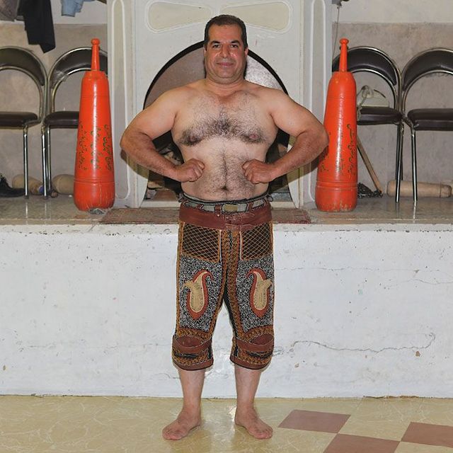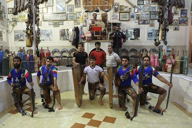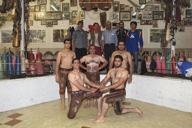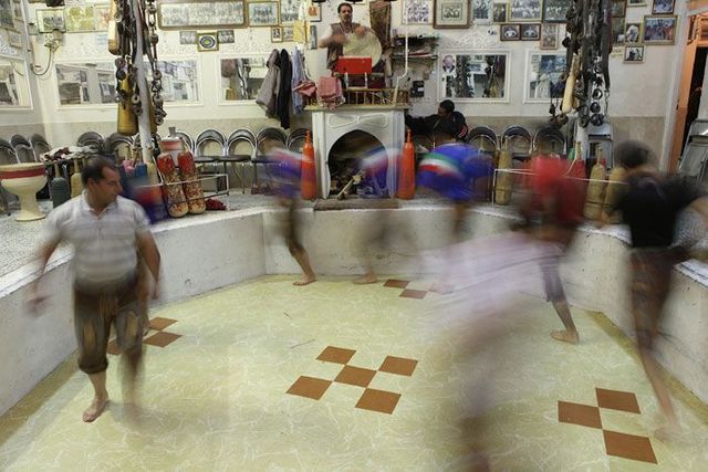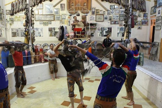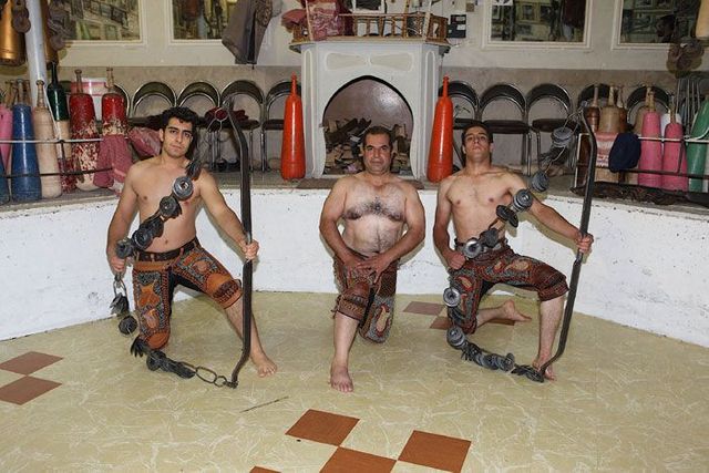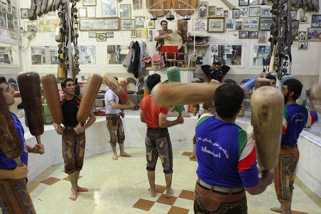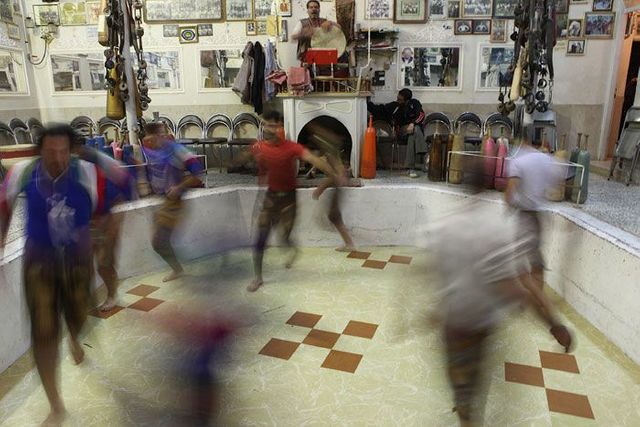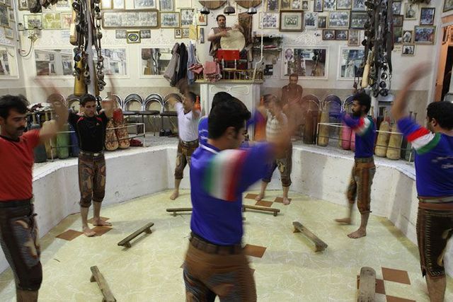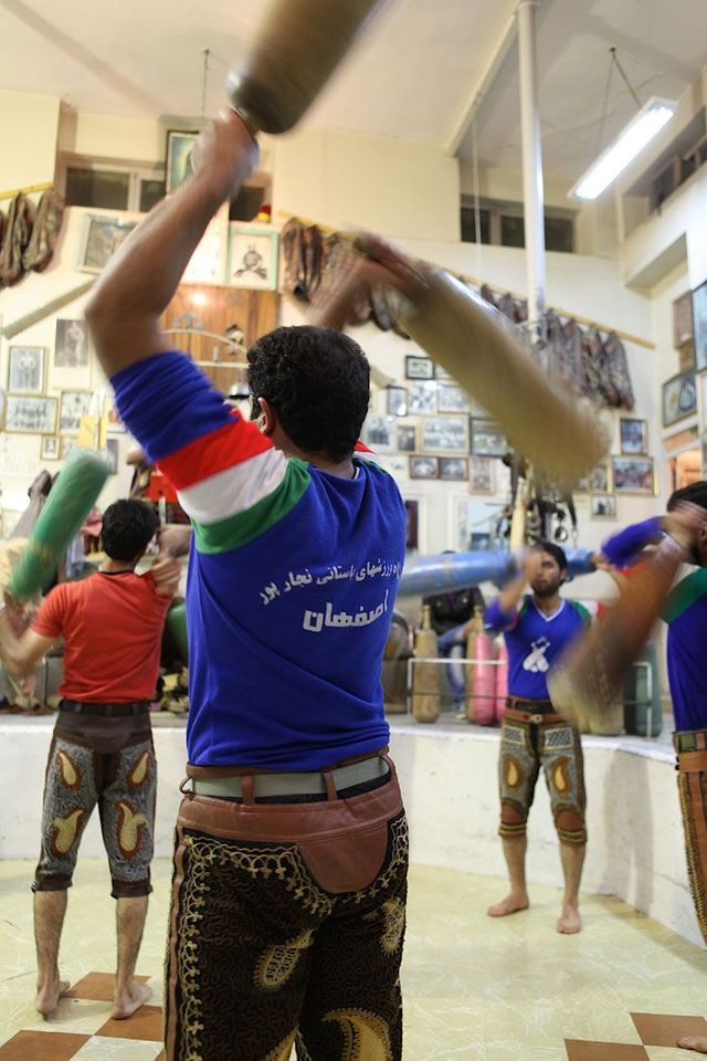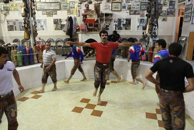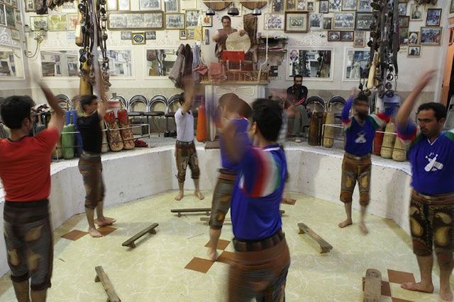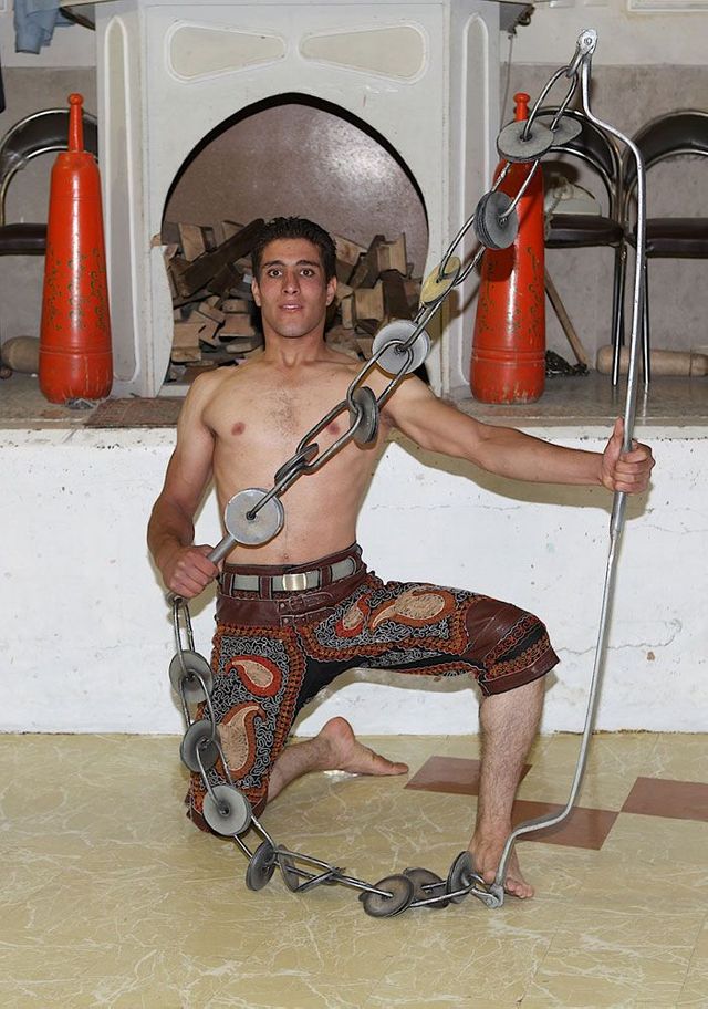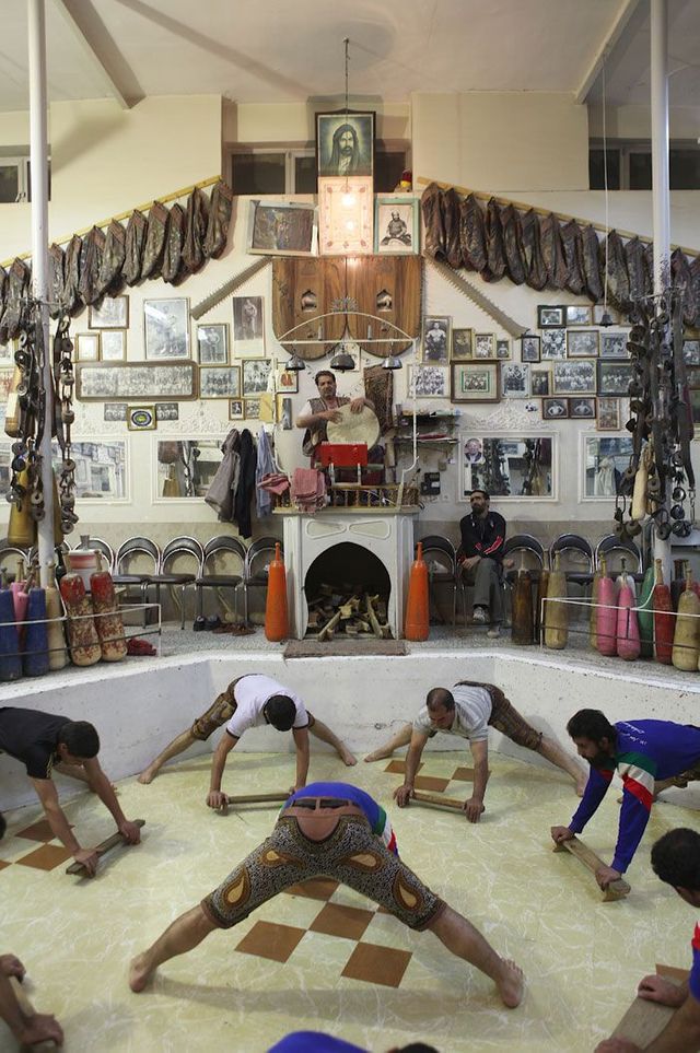 Er sitzt auf seinem Podest und gibt den Rhythmus vor, er ist ein Vorbild für die Athleten und muss die wichtigsten persischen Gedichte auswendig können. Die Männer stellen sich in die achteckige Übungsarena, sie ist knapp einen Meter tief in den Boden eingelassen, und beginnen die Keulen zu schwingen, zum Takt des Flöten- und Trommelspiels oder aber zu Auszügen aus dem persischen Königsbuch. Seit der Revolution von 1979 werden auch Koranverse rezitiert.