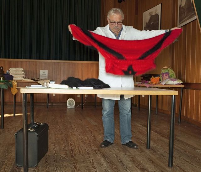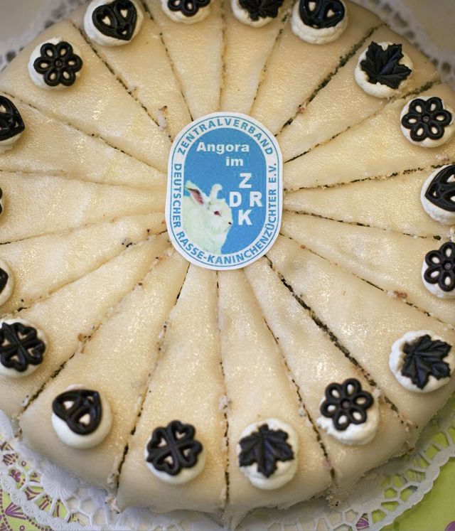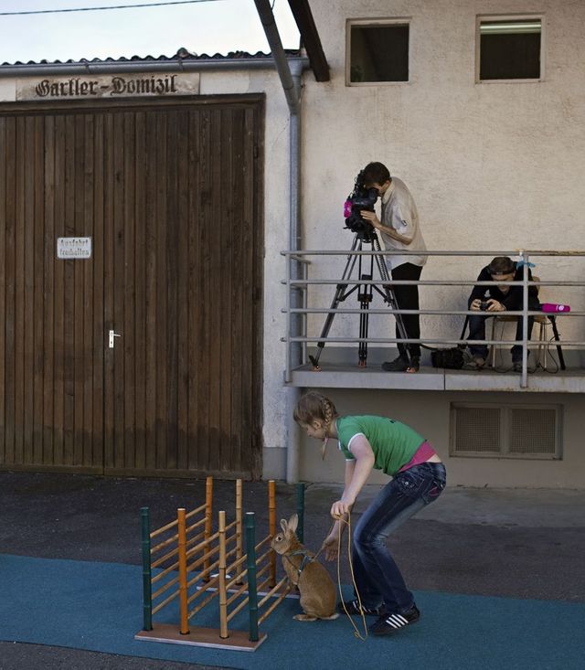 Ich war deutschlandweit unterwegs, habe Kaninchenzüchter im Stall besucht oder Veranstaltungen dokumentiert: Etwa in Chemnitz, wo es 1880 den ersten Zuchtverein gab, weshalb die Stadt von Züchtern als "Wiege der Kaninchenzucht" bezeichnet wird. In Niedersachen gibt es regelmäßige Erzeugerschauen, bei denen vor allem Frauen und Kinder Handarbeiten präsentieren, von verarbeiteten Fellen bis zu Stickereien ist alles dabei. Zum Beispiel wiegen in Norddeutschland Züchter von Angorakaninchen bei einer Leistungsschau das geschorene Fell ihrer Tiere.