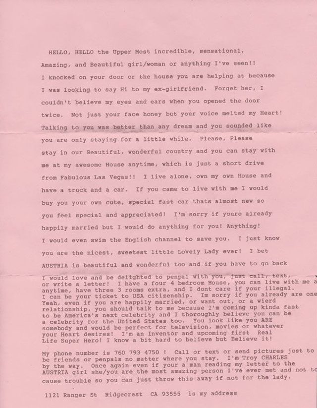 Während ich in Vegas war, klopfte einmal ein Mann an meine Tür, weil er glaubte, seine Ex-Freundin wohne noch dort. Er begann, mich auszufragen. Eine Woche später bekam ich diesen Brief von ihm. Er schrieb, dass er sich in dieser kurzen Zeit, in der wir gesprochen hatten, total in mich verliebt hätte. Diese Art, wie er versuchte, mich an sich zu reißen, war übertrieben und fast schon inszeniert. Ich finde, das spiegelt Las Vegas gut wieder.