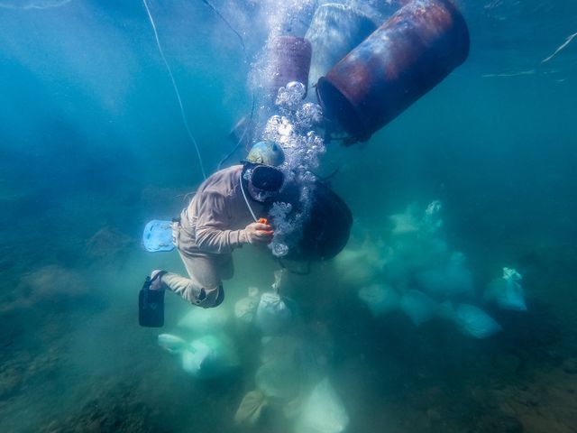 Claudio Sieber: Ja, absolut. Am Strand stehen Kompressoren, an die Schläuche angeschlossen sind. Diese Schläuche nehmen die Taucher in den Mund, durch die bekommen sie unter Wasser Luft. Einige sind so geübt, dass sie mit Hilfe der Schläuche einen ganz Tag unter Wasser arbeiten können.