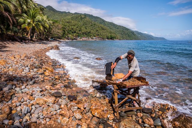 Ja, die Spanier haben da schon vor circa 300 Jahren geschürft, allerdings nicht im Meer, sondern oberirdisch. In den 1970er Jahren gab es sogar einen kleinen Goldrausch, ich habe mir sagen lassen, dass zehntausend Filipinos in der Gegend nach Gold gesucht haben. Die einen haben im Stollen gegraben, andere sind den Adern bis ins Meer gefolgt. Heute leben nur noch die Familien der rund 300 emsigen Goldfischer von Pinut-ans Edelmetall, das jetzt vorwiegend unter Wasser liegt. Die meisten arbeiten im Team: Die Taucher holen Sand, Kiesel und Steine herauf. Einige klopfen wohl unter Wasser mit Metallstangen auf die Steine oder reiben loses Geröll nahe dem Ohr aneinander – am Klang können sie erkennen, ob Gold enthalten ist! Oben gibt es Leute, die die Steine zerkleinern und alles dann in Rinnen auswaschen, so dass der Goldstaub gewonnen werden kann.