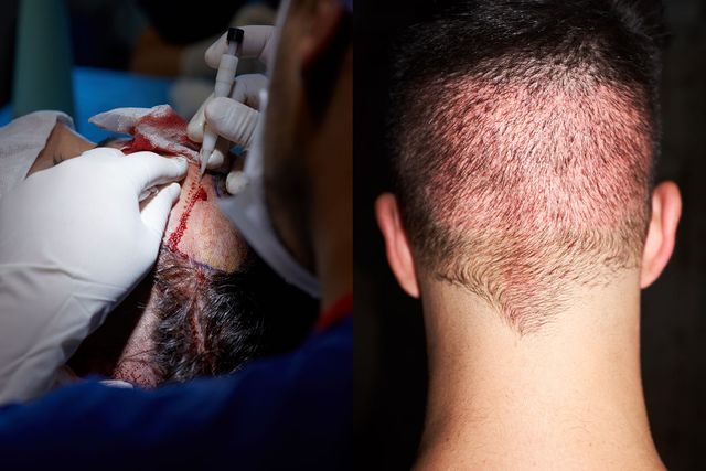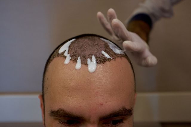 Bevor die Haarwurzeln an der Spenderstelle am Hinterkopf entnommen werden, wird der Patient örtlich betäubt. Dann wird eine Kochsalzlösung gespritzt - das soll die Haut ein wenig von der Schädeldecke lösen. Der Kopf sieht dann angeschwollen aus. Die Haarwurzeln werden mit einer Art Kugelschreiber direkt eingestanzt. Das nennt man DHI-Methode. Wie in Akkordarbeit haben drei Krankenpflegerinnen erst die Grafts, also die Haarwurzeln, vom Hinterkopf entnommen, mit einer Flüssigkeit aufbereitet und dann mit dem Pen in die kahlen Stellen des Schädels eingedrückt. Der Arzt selbst war nicht mehr dabei. Über neun Stunden hinweg immer die gleiche Abfolge. Der Pen hat die ganze Zeit geklickt. Klick. Klick. Klick. Insgesamt wurden meinem Freund 3.200 Haare transplantiert.