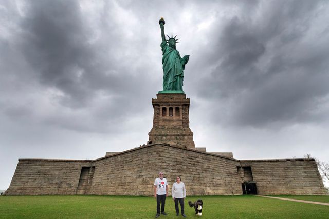 Der Retuscheur aus den Philippinen hat meine Eltern unter seine Familie gemischt, das finde ich schön. Ich hab es auch gerne etwas trashig, darum mag ich das Bild in Bolivien auf dem Salzsee sehr. Wie meine Eltern da zwschen Himmel und Erde stehen, das ist so schön absurd. Oder das Bild aus Uganda, wo die Giraffen das Frühstück essen. Und meine Eltern vor der Freiheitsstatue in New York, da hat die Bildbearbeiterin den Hund von Barack Obama reingebastelt. Ich mag es, wenn die Leute ihren Humor mit ins Bild retuschieren.