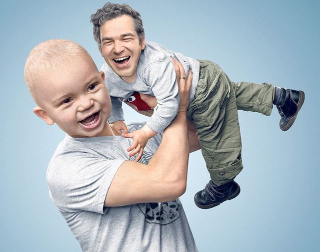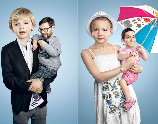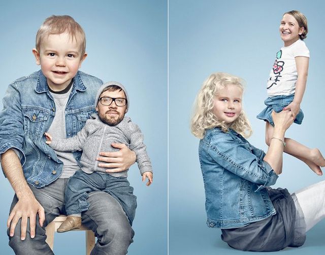 Erstmal haben wir beim Styling darauf geachtet, dass die Kleidung der Eltern nicht zu erwachsen aussah. Wirklich schwer war es, bei jedem Foto immer für zwei mitzudenken, die beiden Gesichtsausdrücke müssen ja zusammenpassen. Darum haben wir auch nicht nur ein Foto gemacht, sondern erstmal nur die Körper fotografiert, um abzustimmen, wie der Erwachsene das Kind hält. Dann haben wir die beiden Köpfe einzeln fotografiert. Es muss ja alles zusammenpassen, die Lichtrichtung etwa, oder die Drehrichtung.