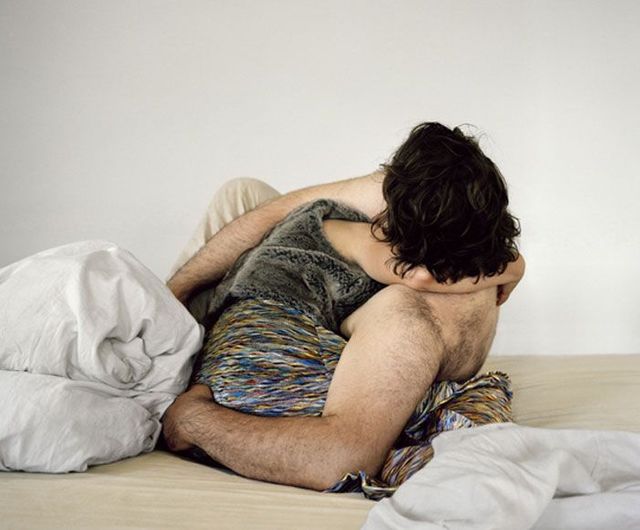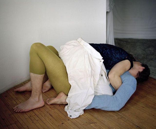 Eine große Rolle spielte die Kleidung. Ich habe sie selbst ausgewählt, meistens aus den Kleiderschränken der Modelle. Jedes Kleidungsstück hat sein eigenes Material, seine eigene Oberfläche. Diese inhaltliche Dimension der Materialitäten spiegelt das Verhältnis eines Paares wieder: Einige wirken warm und freundlich, andere spröde und rau. Dazu kam der Raum, den ich nach meinen Vorstellungen gestaltet habe. Hier wurde ein Kissen gerückt, da eine Matratze aufgestellt. Die fertigen Gebilde ähneln Skulpturen, die man jeweils nur aus einem ganz bestimmten Blickwinkel heraus erkennt - und den liefere ich mit der Kamera.