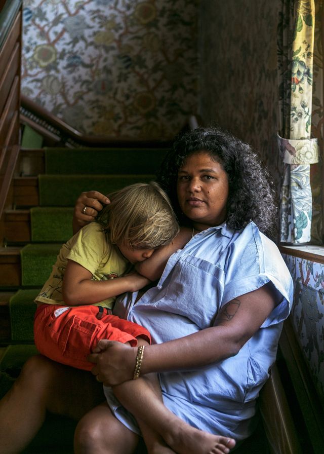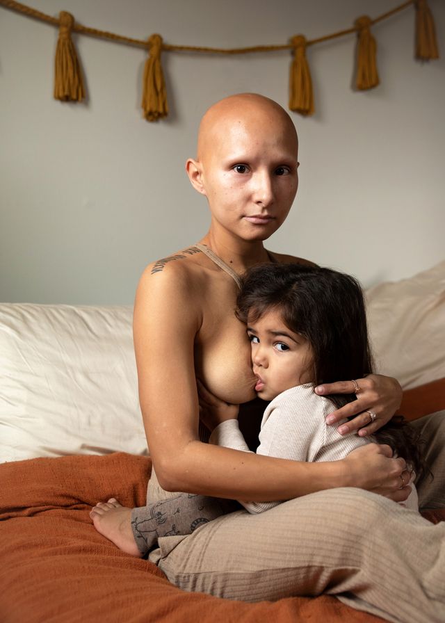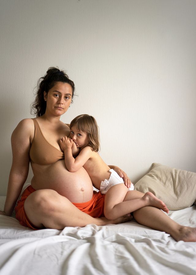 Ich habe in meinem Bekannten- und Freundeskreis gefragt, Hebammen kontaktiert und auf Instagram recherchiert. Die Mütter, die ich fotografiert habe, verstecken sich nicht – aber nicht alle zeigen sich so offen, wie beispielsweise Kim mit ihrer sechsjährigen Tochter aus Kalifornien. Eine Mutter lebt in Michigan, zwei in Australien, die meisten in Deutschland. Im Moment besteht die Serie aus sechzehn Frauen, ich würde sie gerne weiterführen. Doch es ist die Frage des Findens. Mir ist wichtig, dass ich den Frauen mit Respekt begegne und keine Art Freakshow ausstelle. Ich will sie nicht unbedingt als Heldinnen präsentieren, sondern als starke und selbstbewusste Persönlichkeiten. Deswegen schauen sie direkt in die Kamera, werfen den Blick zurück, damit sich der Betrachtende ertappt fühlt.