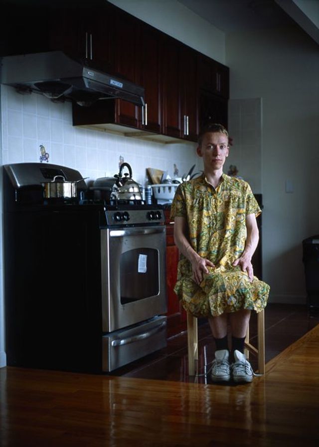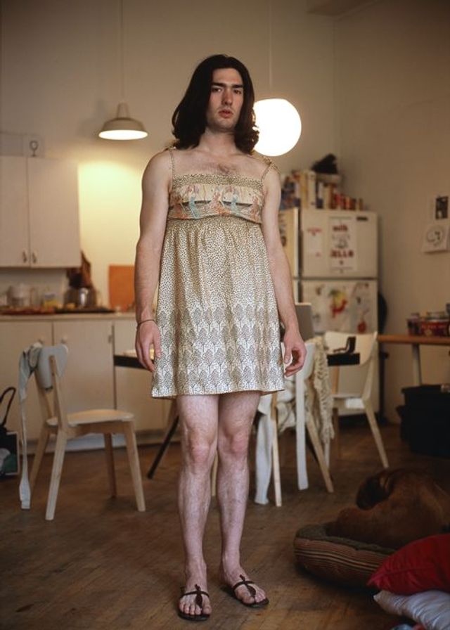 Sie alle tragen Outfits ihrer Freundinnen. Zu Beginn des Projekts, als ich mit ihnen Testfotos schießen wollte, entschieden sich die meisten Pärchen für lustige Kleider. Der verrückteste Rock mit dem lustigsten T-Shirt. Doch ich will daraus keinen Witz machen. Ich wollte keine Verkleidungen. Sie sollten Outfits tragen, mit denen ihre Partnerinnen für gewöhnlich genauso herumliefen. Also das Couch-Herumhäng- oder das Lieblingsoutfit. Egal was, es sollte nur echt sein.