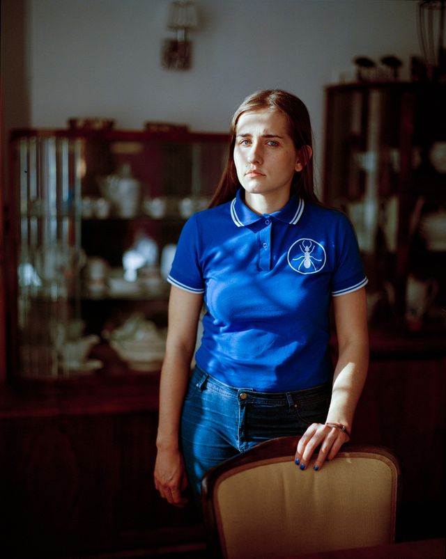 Ein gutes Beispiel ist Maria, die junge Frau, die auf dem Foto das blaue Polohemd mit der Ameise trägt. Maria ist heute Mitte 20, kommt aus einem gut situierten Zuhause und hat studiert. Sie sagt, dass sie sich schon immer für Geschichte interessiert hat und sich politisch engagieren wollte, aber in ihrer Umgebung herrschte oft politisches Desinteresse. Die Haltung »Es ändert ja doch nicht« ist eine typische Nachwirkung des Kommunismus, die auch in meiner Generation noch sehr stark zu spüren war. Die Rechten besetzen jetzt diese Lücke, sie vermitteln den Jüngeren ein Gefühl von Gemeinschaft und Engagement. Mit 16 ist Maria der ONR beigetreten, einer faschistische Organisation, weil sie dachte: »Wow, die machen was für unsere Heimat und das ist doch wichtig!« Sie hat eine Ortsgruppe geleitet und ist bei Demos mit Fackeln, Fahnen und Springerstiefeln durch die Straßen marschiert.