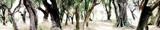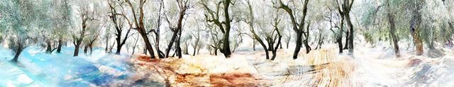 Ich fuhr mehrmals nach Ligurien, um dort einen Olivenhain zu fotografieren. Die sich durch die untere Bildhälfte ziehenden Strukturen sind verschiedenfarbige Netze, die zur Ernte der Oliven aufgespannt werden.