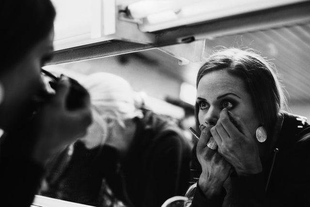 Der Wettkampf in Niedersachsen, bei dem ich dabei war, war für mich wie ein Paralleluniversum. Wir waren dort in einer hässlichen Halle, in der wir Stunden vor dem eigentlichen Wettkampf angekommen sind. Die Umkleiden waren winzig. Die meisten Teilnehmerinnen lagen alle völlig dehydriert in dem kleinen Raum und schienen fertig mit den Nerven. Bei manchen habe ich mich gefragt, ob sie es überhaupt auf die Bühne schaffen. Die Stimmung war aber trotzdem sehr konzentriert. Jeder war mit sich selbst beschäftigt, die Frauen schminkten sich, wurden mit dieser typischen braunen Farbe eingeschmiert, letzte Posen wurden geübt. Es gab kein Gezicke unter den Frauen hinter der Bühne. Was aber total skurril war: Manche Frauen, vor allem die jüngeren, hatten ihren Vater oder Freund dabei, die sie wie ein Coach gepusht haben. »Du schaffst das! Durchhalten« – obwohl die Mädchen total am Ende waren. Réka hatte zwar Begleitung, für sie war der Wettkampf aber eine völlig autonome Entscheidung.