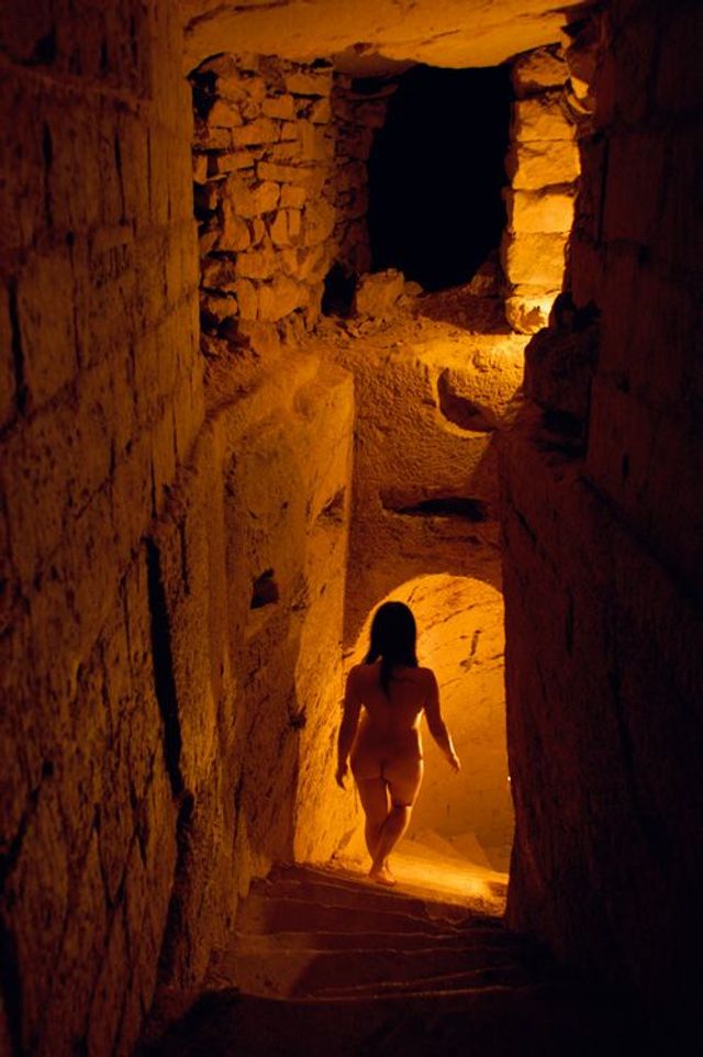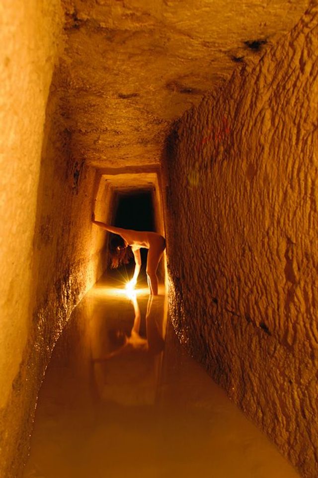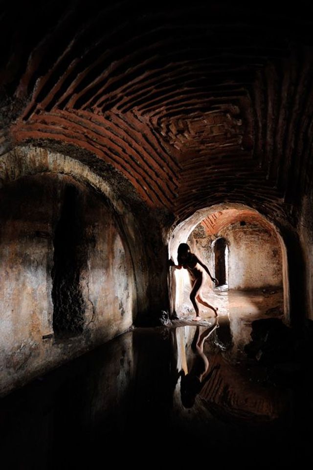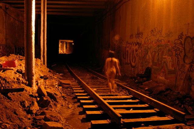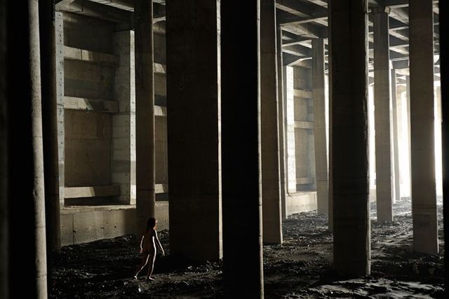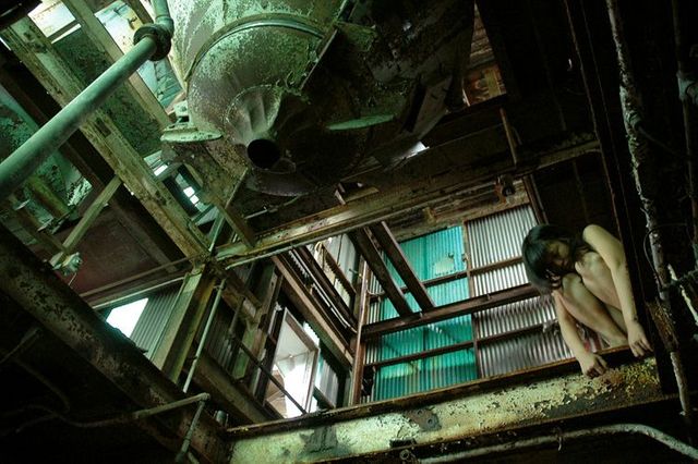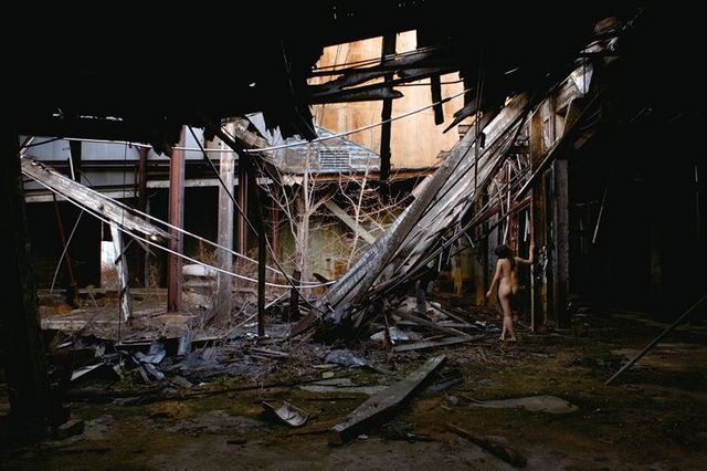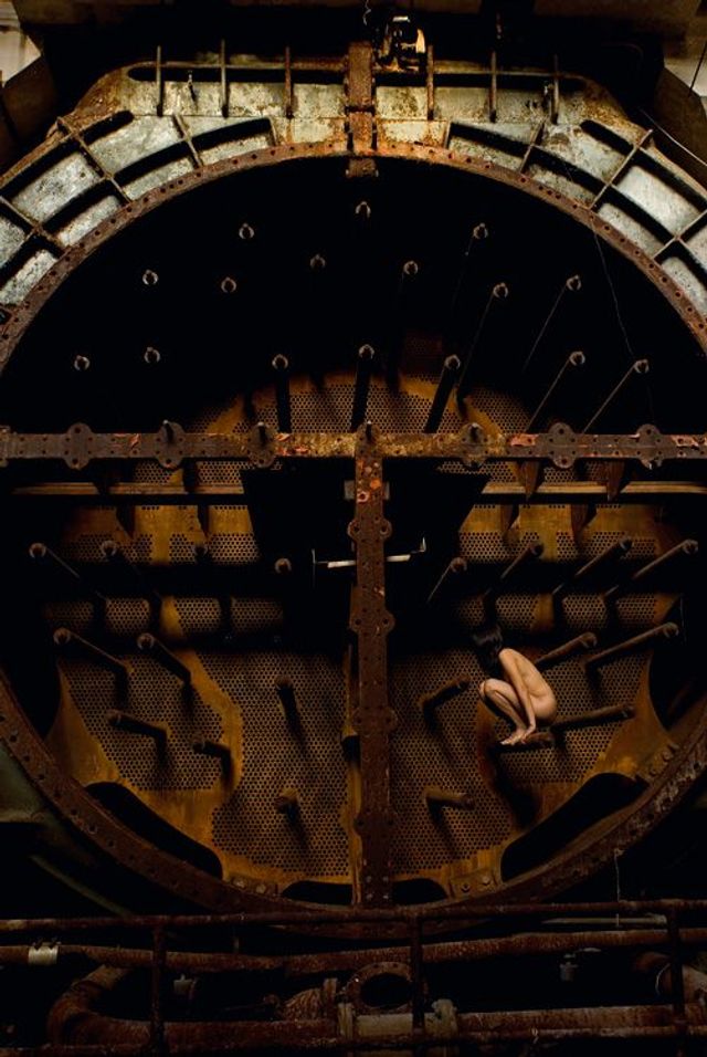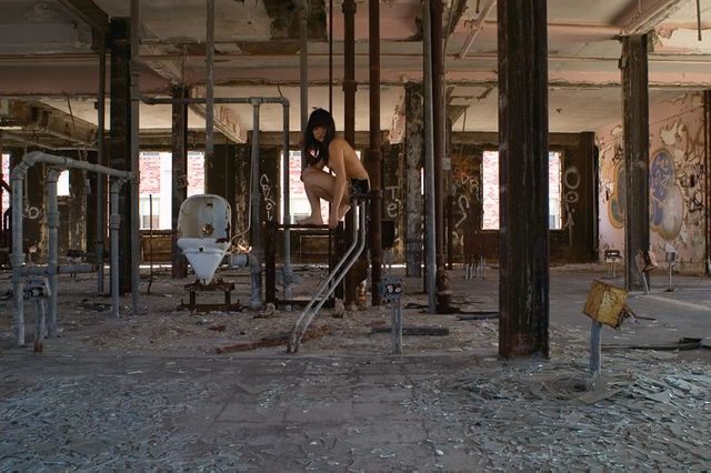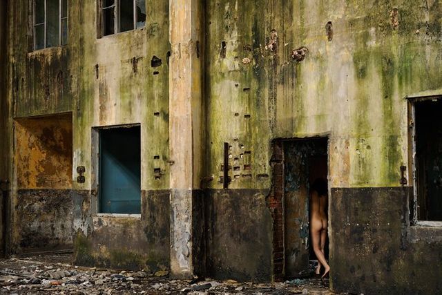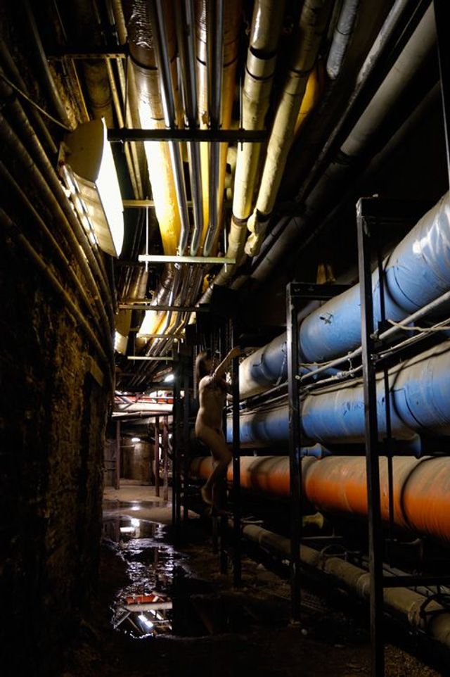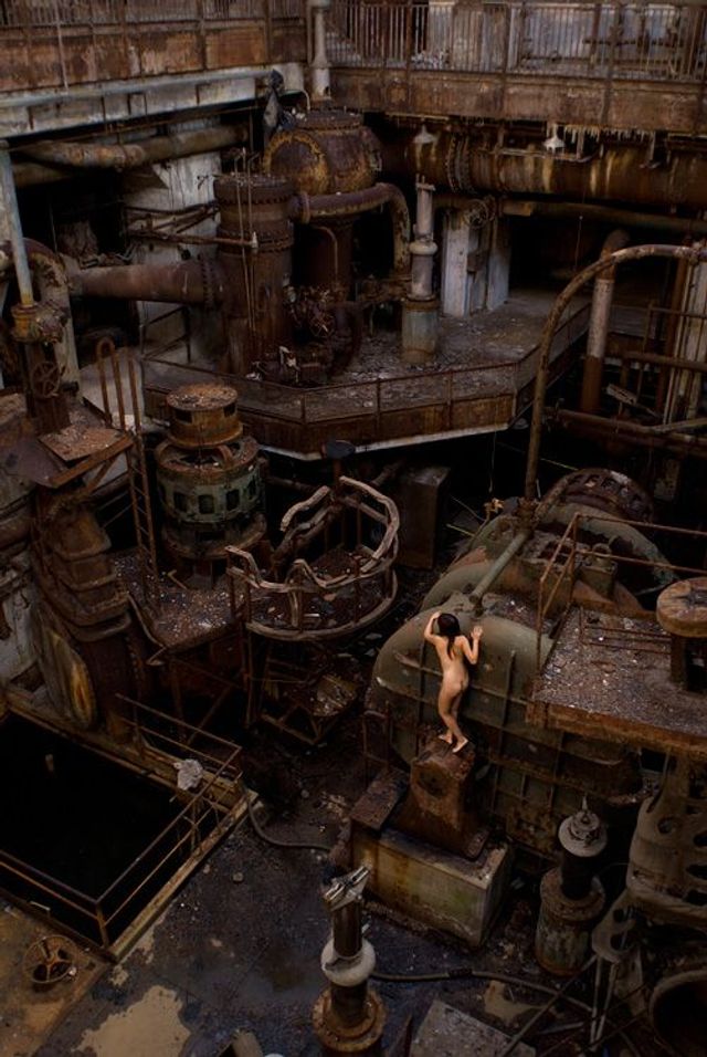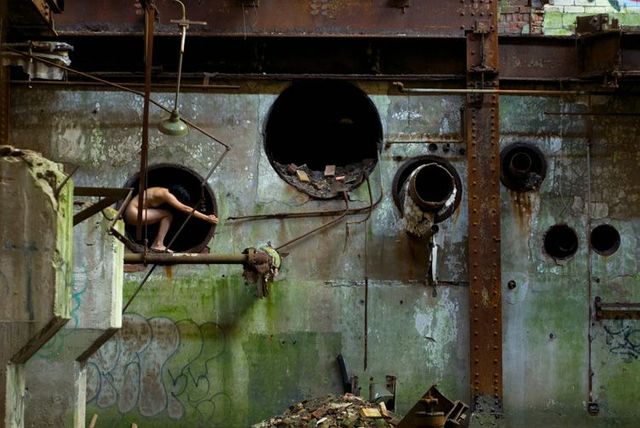 Kim: Ich habe im Jahr 2004 angefangen, Orte in der Stadt zu erkunden, die selten besucht werden. Tunnel oder verlassene Fabrikgelände etwa. Als ich dort Schnappschüsse machte, habe ich gefühlt, dass etwas fehlte. Ich habe angefangen, mir ein lebendiges Wesen vorzustellen, das diese verfallenen Räume bewohnt. Kleidung ordnet die Bilder einer Zeit und einem kulturellen Hintergrund zu, das wollte ich nicht. Nackt korrespondiert der menschliche Körper besser mit dem Raum, am einfachsten war es mich selbst in Szene zu setzen. Am Anfang war ich es nicht gewöhnt, nackt vor der Kamera zu stehen, aber als ich entspannter wurde, habe ich gemerkt, wie die Räume selbst sich veränderten: raue Orte wurden ruhiger, düstere wurden hell.