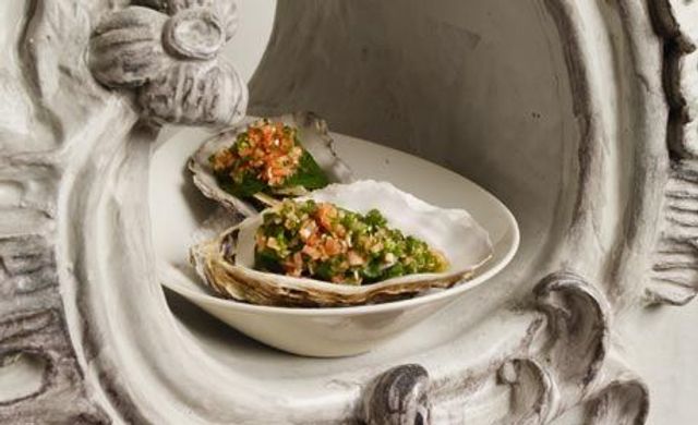 Die unteren Schalenhälften von 8 ausgelösten Austern (Belon oder Kelly) gut auswaschen und trocknen. In grobes Meersalz setzen und bereithalten. 8 große Spinatblätter blanchieren, abschrecken und auf einem Tuch abtropfen lassen. 1/2 zerdrückte Knoblauchzehe mit 1 EL Olivenöl gut verrühren und die Spinatblätter damit bestreichen. Die Austern darauflegen und in das Spinatblatt einschlagen. Für die Vinaigrette 4 fein gewürfelte Schalotten in 100 ml Geflügelfond 1–2 Minuten kochen, 1 EL Rotweinessig und 1/2 EL Olivenöl dazugeben, salzen, pfeffern, abkühlen lassen. 1 EL Olivenöl in der Pfanne erhitzen und die Austern bei geringer Hitze etwa 1 Minute garen. Zuletzt 1 EL fein geschnittenen Schnittlauch unter die Vinaigrette rühren. Etwas Schalottenvinaigrette in die Austernschalen geben und die warmen Austern darauflegen.