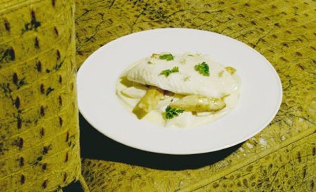 Gebratener Steinbutt auf weißem Spargelragout mit Holunderblütenessigschaum