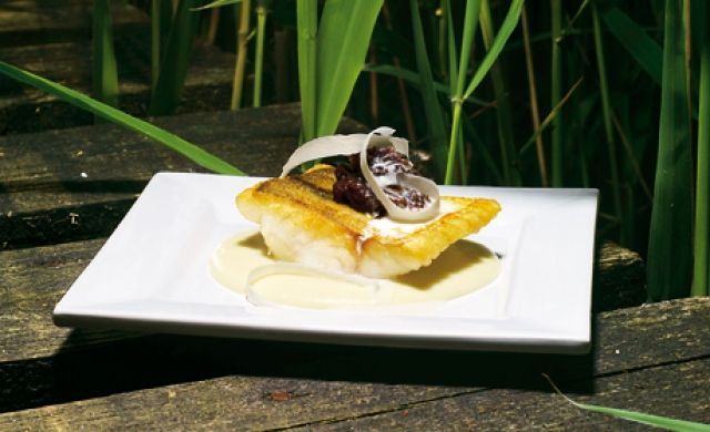 Zwiebelmarmelade 400 g rote Zwiebeln, 400 ml trockenen Rotwein, 100 g braunen Rohrzucker, Salz, Pfeffer. Zutaten in einen Topf geben und bei mittlerer Hitze einkochen lassen, bis kaum noch Flüssigkeit in der Masse ist, dann nach Belieben leicht süßlich abschmecken. Kartoffel-Creme 200 g festkochende Kartoffeln schälen, in kleine Würfel schneiden, ebenso 300 g Lauch, aber nur das Weiße, in etwas Pflanzenöl anschwitzen. Mit 150 ml trockenem Weißwein und 500 ml Geflügelfond ablöschen, auf 2/3 einreduzieren lassen. 150 ml Sahne dazugeben. Im Küchenmixer pürieren, durch ein feines Sieb passieren, danach mit Salz, Pfeffer, Zucker abschmecken. Meerrettichschaum 100 g frisch geriebenen Meerrettich in Butter anschwitzen. Mit 100 ml Cidreessig ablöschen und mit 400 ml Geflügelfond und 200 ml Sahne auffüllen, nochmals leicht einkochen lassen. Die Sauce pürieren, abpassieren und mit Salz, Pfeffer, Zucker, Zitronensaft abschmecken. 600 g Zanderfilet in Öl-Butter-Gemisch braten, bis es zartbraun ist. Anrichten und servieren. BASISZUTATEN: Oliven- und Pflanzenöl, Obst- und Balsamico-Essig, Butter, Mehl, Salz, Pfeffer, Gewürze, Zucker, Senf, Sojasauce, Zitrone, Weiß- und Rotwein, Zwiebeln, Knoblauch, Sahne, Brühe