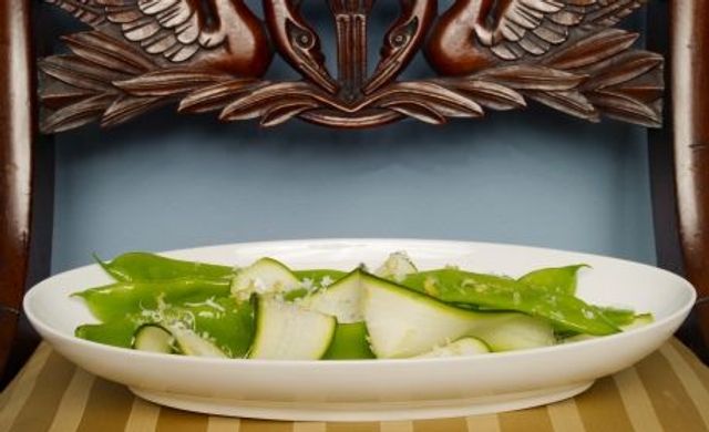 Von zwei Zucchini die Enden abschneiden und sie mit einer Aufschnittmaschine oder einem Gemüsehobel der Länge nach in feine Scheiben schneiden. Von 250 g Stangenbohnen die Enden abschneiden. Die Bohnen in einem großen Topf in kochendem Salzwasser vier bis fünf Minuten blanchieren, in Eiswasser abschrecken und in einem Sieb abtropfen lassen. Die Zucchinischeiben in einer Schüssel mit Salz und Pfeffer würzen und leicht massieren, bis sie geschmeidig sind. Die Bohnen zugeben und mit dem Abrieb von einer Zitrone mischen. In einem leichten Dressing aus dem Saft einer Zitrone und drei EL Olivenöl marinieren. Mit 50 g geriebenem Pecorino bestreuen. Tim Mälzer kocht in seinem Hamburger Restaurant »Die Bullerei«. Sein aktuelles Kochbuch: »Kochbuch« im Goldmann-Verlag.