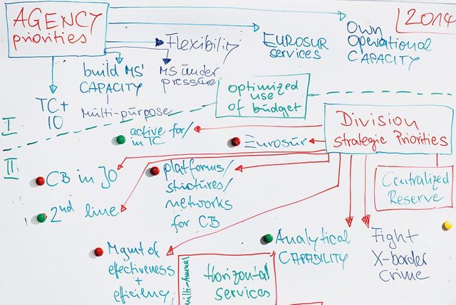 Von den »Push-back«-Aktionen, dem ungesetzlichen Zurückdrängen von Einwanderern in Grenznähe, auf hoher See, für die Frontex immer wieder kritisiert wird, erzählt Mohr nicht. Doch ein Blick an die Pinnwand hinter Mohr verrät, dass sie hier sehr wohl wissen, dass es passiert. Wozu sonst hängt dort ein kleiner Zettel, auf dem eine neue Sprachregelung notiert ist: Für »Push-back« steht dort »nicht abgewickelte Rücksendung«, das Wort »Zaun« wird durch »technisches Hindernis« ersetzt, und statt »Abschreckung« soll es »Prävention« heißen. Man weiß bei Frontex um das schlechte Image. Da möchte man wenigs-tens etwas gegen die bösen Wörter tun.