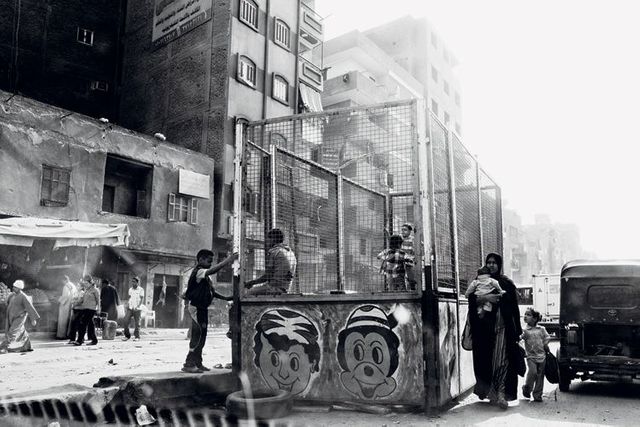 Sharabiya. Lange Reihen von Wohnblocks mit zerplatzten Fassaden. Lichtlose Gassen, die sich auf müllübersäte Plätze öffnen. Vor dem Eisentor einer Bäckerei drängen sich Frauen; es sieht aus, als kämpften sie miteinander. Dreirädrige Tuk-Tuks. Schafherden. Im Rauch brennender Autoreifen wippen Kinder in verrosteten Schiffschaukeln. Weiter draußen hausen Tausende in Zelten. Die Slums von Kairo. Halb Dorf, halb Apokalypse. Nicht das Gegenmodell der Stadt, sondern ihre Essenz.