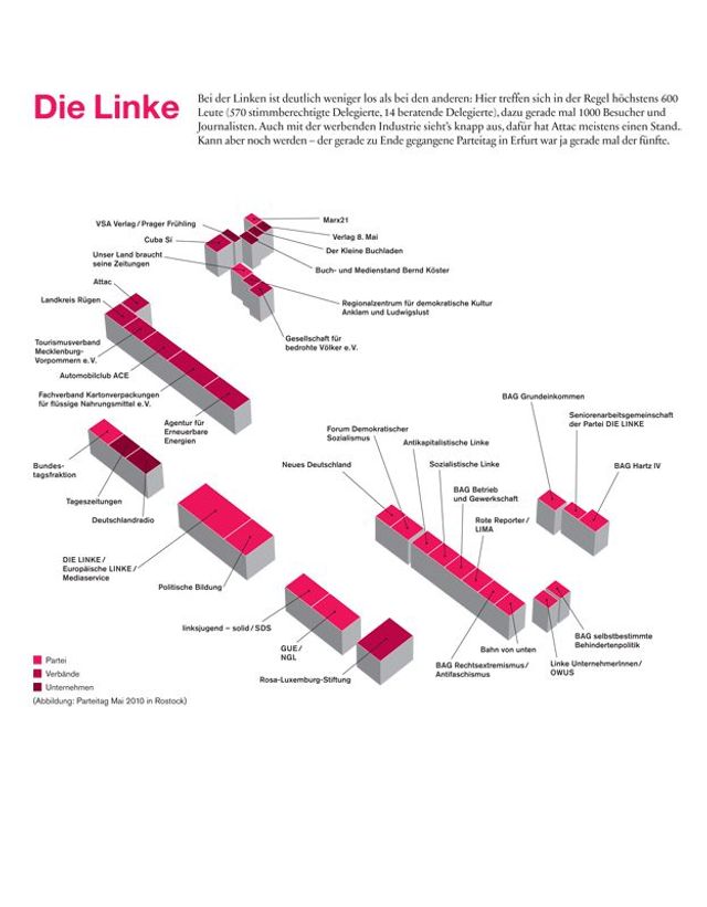 Kein Wunder, dass manche Firmen Parteitage als ideales Werbeumfeld sehen: Wo sonst hat man so viele gelangweilte Menschen vor sich, die dankbar sind für jede Abwechslung? Also kommen sie alle: die Autofirmen, die Krankenkassen und Energieversorger, die Versicherer. Verteilen Broschüren, Kugelschreiber, Freigetränke, Snacks. Abstimmungen hin oder her, auf einmal sind die Messehallen doch wieder genau das: Messehallen. Im Saal findet statt, was abends die Nachrichten zeigen, die meiste Zeit aber verbringen die Delegierten im Foyer und hoffen, dass Red Bull bald wieder frisch gekühlte Dosen ausgibt.