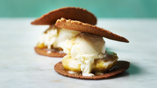 4. Jeweils 2 Mohnwaffeln mit Äpfeln und Eis füllen.