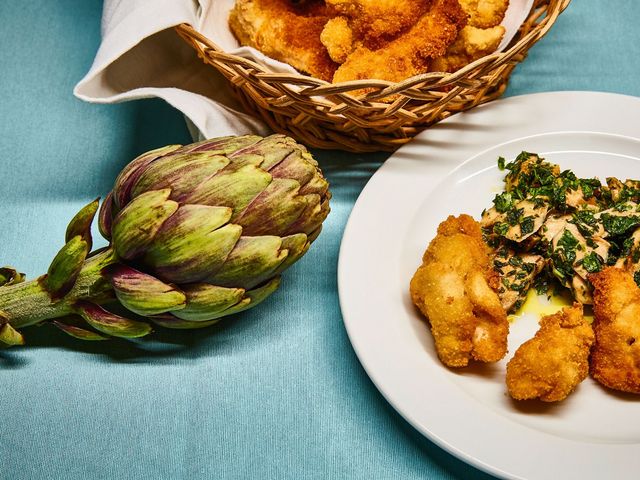 Artischocken sind ein Saisongemüse, das Schöne daran: Sie haben zweimal Saison. Im Sommer blühen die dicken bretonischen Sorten in Frankreich, zum Jahresanfang kommen verschiedene Artischocken aus Süditalien. Winterartischocken sind kleiner, manche sehr stachelig, manche mit sanft gerundeten Blütenblättern. In Sizilien und Sardinien ist es diesen leckeren Disteln im Sommer zu heiß, sie ziehen sich zurück, die Pflanzen sind dann kaum sichtbar. In der Bretagne genießen Artischocken den milden Sommer und ruhen dafür im Winter. Zur Zeit mag ich meine Artischocken am liebsten innen saftig und außen ein bisschen knusprig – eine Möglichkeit habe ich kürzlich schon für Sie aufgeschrieben. Hier eine zweite, die mir auch sehr gut gefällt. Zuerst schmore ich die Artischocken, ähnlich wie für die klassischen »Carciofi alla romana«. So werden sie schön zart und aromatisch. Aber während sie alla romana weich bleiben, backe ich meine Artischocken anschließend knusprig – ähnlich wie bei »Carciofi alla giudìa«, einem zweiten Klassiker aus Rom, wofür normalerweise ganze Artischocken zweimal frittiert werden. Ich kombiniere beide Methoden, so werden sogar Blattenden knusprig, die sonst noch ein kleines bisschen zäh gewesen wären.