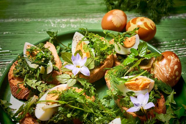 5. Die Brote rösten oder toasten, mit der grünen Creme bestreichen. Eier pellen und vierteln auf die Bruschette legen. Restliche Kräuter mit restlichem Zitronensaft und einer Prise Salz würzen, auf den Bruschette verteilen.