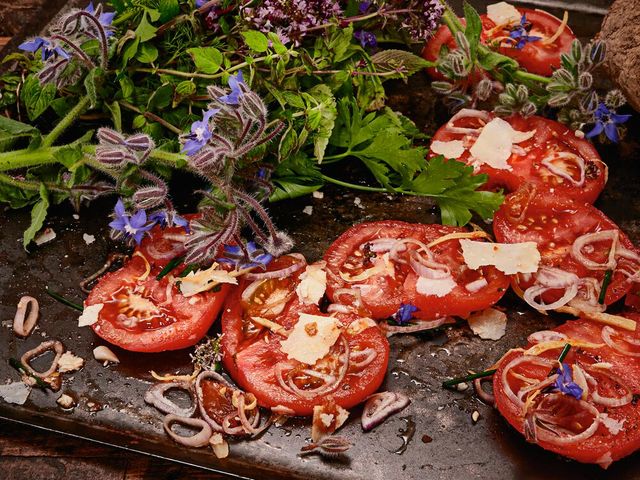 Für größtmöglichen Tomatengenuss die – am besten sonnenwarmen – Früchte schneiden, auf den Teller legen, nicht mehr bewegen. Direkt auf dem Teller würzen oder, je nach Rezept, mit Sauce benetzen. Wenn Köche oder Köchinnen das wollen, klappt das auch im Restaurant. Zuhause aber leichter, da strömen einfach keine hundert Gäste gleichzeitig an die Tische und verlangen nach Aufmerksamkeit und Essen.