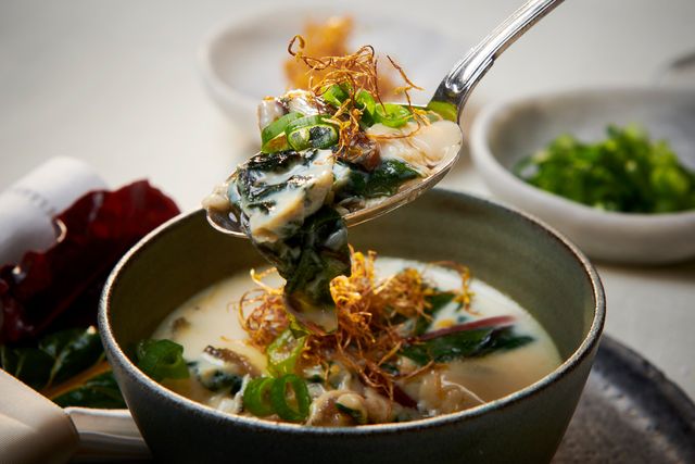 1. Brühe mit dem Kombu aufkochen, ausschalten und 20 Minuten ziehen lassen. Mangold waschen, die Stiele aus den Blättern heraus und dann in Scheiben schneiden. Blätter ein paarmal durchschneiden, beides zusammen mit etwas Butter 5 Minuten in einem Topf mit Deckel dünsten, dabei leicht salzen (oder Spinat auftauen, ausdrücken und mit Butter einmal kurz erhitzen). In 4 kleine Schalen oder Tassen verteilen.