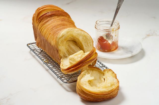 9. Aus dem Ofen nehmen, kurz ruhen lassen, dann vorsichtig aus der Form gleiten lassen. Aprikosenmarmelade mit 2 EL heißem Wasser verrühren, falls nötig durch ein Sieb streichen, Kasten-Croissant damit bestreichen. Auf einem Gitter abkühlen lassen, möglichst am selben Tag aufessen (es schmeckt auch noch an den folgenden Tagen, aber nicht mehr ganz so frisch).