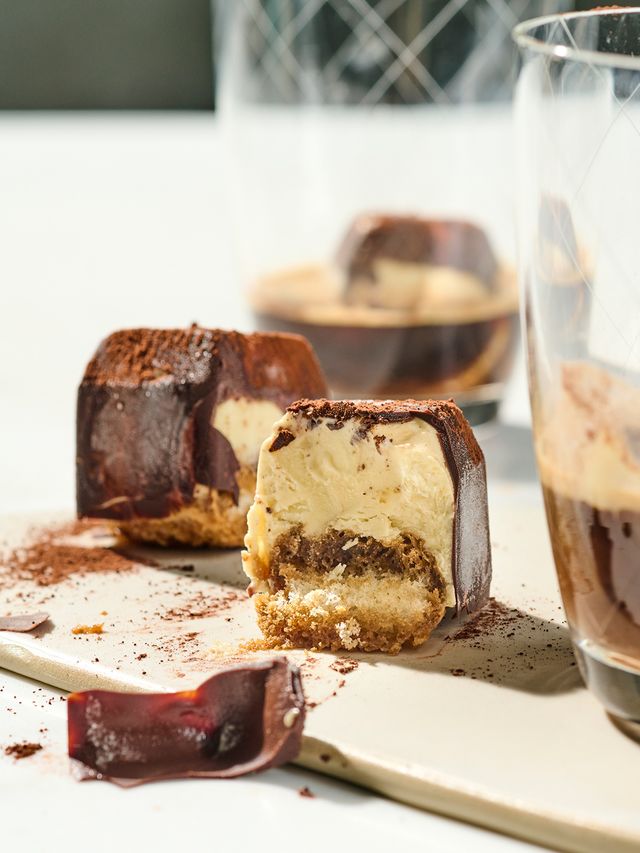6. Tiramisu Eiskonfekt aus dem Tiefkühler nehmen und sofort aus den Formen lösen. Kurz stehen lassen, damit sie etwas weicher werden. Mit etwas Kakaopulver bestreuen und entweder zum Kaffee servieren oder als Affogato mit Espresso übergießen.