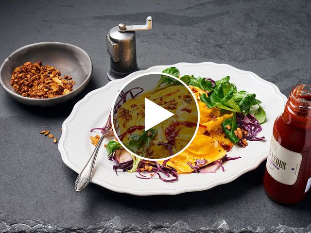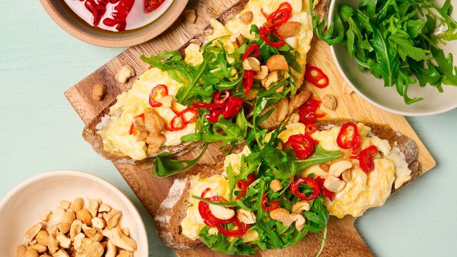 3. In Olivenöl ein saftiges Rührei braten, auf den Broten verteilen, mit Rucola, Peperoni und Cashews üppig bestreuen.