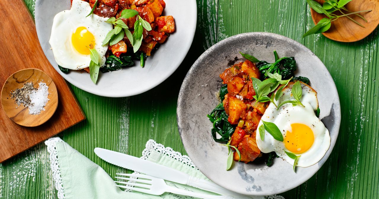 7. Feldsalat mit der restlichen Vinaigrette marinieren, um die Omelettes drapieren. Omelettes mit Spicy Granola oder Dukkah bestreuen und mit Chilisauce beträufeln.