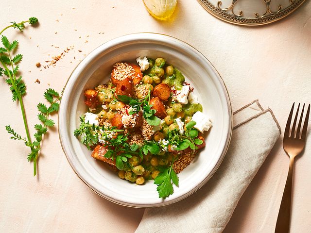 Das Theaterstück wird als Melodram beschrieben, das in einer Shangri-La-ähnlichen Enklave in Südamerika spielt, wo der Held mit seinem Flugzeug abstürzt und mit Versprechungen von Unsterblichkeit und Sex umworben wird. Shangri-La ist aber ein fiktiver Ort in Tibet, nicht Südamerika, vorsichtshalber habe ich das Manuskript also gelesen: Handlungsort ist tatsächlich ein von der Außenwelt abgeschlossenes Land im Himalaya und ein Flugzeug stürzt ab. Die abgestürzten Kolonialisten werden von einem fiesen, indigenen Herrscher gefangen gehalten, der Raja will die Männer einer »Grünen Göttin« opfern und die Frau demütigen. Ziemlich blöde und voll von rassistischen Formulierungen. Sowohl die Geschichte als auch das Originalrezept sind also mindestens veraltet. Doch manchmal können wir einen kaputten Begriff mit neuem Leben füllen – nach dem Yoga gibt es nichts Besseres als geröstete Kichererbsen mit meiner frischen Interpretation der Green-Goddess-Sauce.