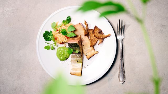 5. Kohlrabi, Hamachi und Liebstöckel-Mayonnaise anrichten, mit kleinen Kohlrabiblättern und Liebstöckel garnieren, Brotchips zerkrümeln und auf den Tellern verteilen.
