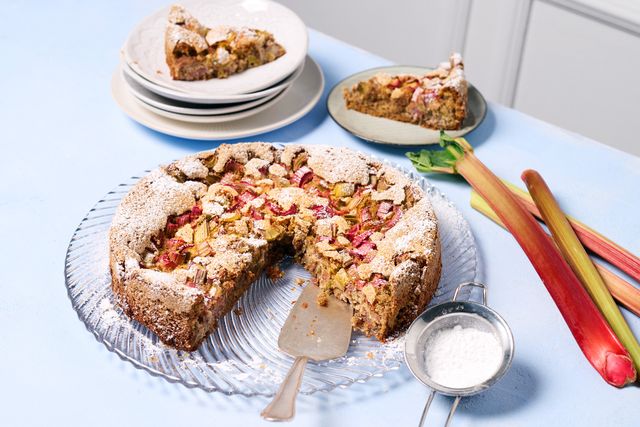 Die besonders schönen, durch und durch roten Rhabarbersorten wachsen erst im zweiten Teil der Rhabarbersaison – und obwohl ich diese Kolumne mit wenig Vorlauf schreibe und fotografiere, damit wir möglichst nahe an der jeweiligen Jahreszeit kochen können, gelingt es mir bei Rhabarberrezepten nur selten für die Fotos einen perfekten Supermodel-Rhabarber einzukaufen. Ihr Kuchen wird wahrscheinlich schöner sein als meiner. Probieren Sie es aus!