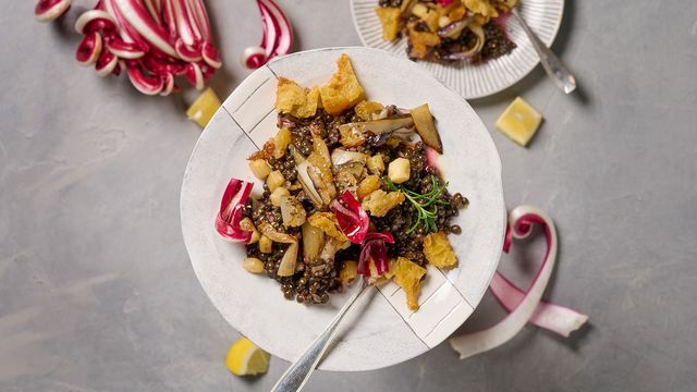 4. Radicchioblätter mit Zitronensaft, Salz, Pfeffer und Olivenöl marinieren. Die Linsen abschmecken, Gemüse und Brösel auf den Linsen verteilen. Wer will, kann etwas Käse über das Gericht reiben – schmeckt auch gut, ist aber nicht vegan.