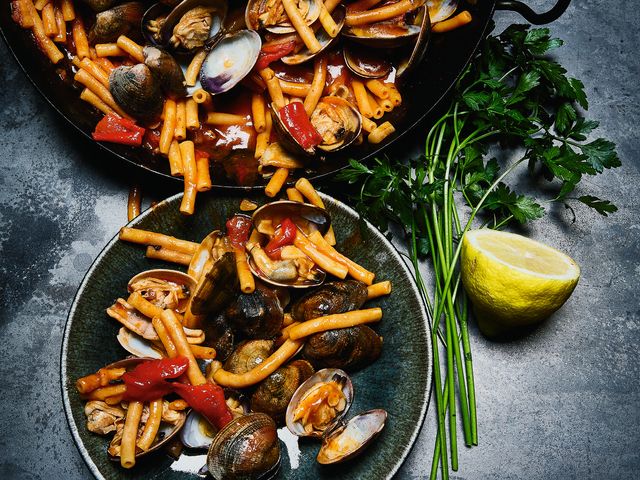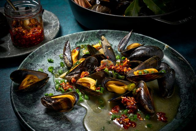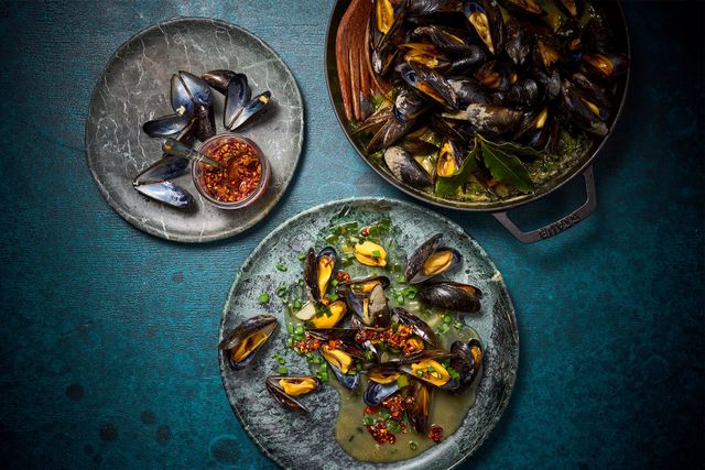 Ähnlich wie für Pommes jahrzehntelang die Wahl der Saucen auf Mayo oder Ketchup beschränkt war, schwammen Miesmuscheln meist in Weißwein oder in Tomatensauce. Dabei lassen sich die nussig-aromatischen Schalentiere super vielfältig zubereiten. Das beginnt mit gedämpften Muscheln plus purem Muschelfond – die einfachste und für mich eine der besten Zubereitungsmethoden. Für Vongole habe ich sie hier beschrieben, schmeckt aber genauso gut mit Miesmuscheln. Sie haben genug Geschmack, um auch mit kräftigen Gewürzen zu harmonieren: Raz el Hanout, Peperoncini oder Koriander passen – sensibel dosiert – alle gut dazu. Gerade bin ich sehr fasziniert von einem Muschelsud mit Mirin und viel Ingwer. Damit der gut gelingt, koche ich den Sud in einem zweiten Topf ein. So konzentriere ich das Aroma und die Muscheln werden trotzdem nicht zu lange gegart. Am einfachsten lassen sich die Muscheln übrigens aus den Schalen lösen, indem man mit einer leeren Muschelschale das Fleisch aus den Schalen löffelt oder indem man eine doppelte zusammenhängende Muschelschale wie eine Pinzette benutzt, um das Muschelfleisch aus den Schalen zu greifen.