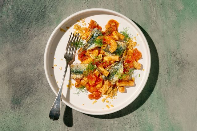 Weil die Arrabbiata sowieso ohne Käse gekocht wird, drängt es sich geradezu auf, eine Variante mit Fisch zu probieren. Man sagt, dass Käse den Fischgeschmack übertüncht, deshalb ist die Kombination aus Fisch und geriebenem Parmesan in Italien ein No Go. Sardinen sind bestens geeignet, denn ihr Aroma wird von Chili und Knoblauch nicht übertönt, sondern ergänzt. Die etwas größeren Makrelenfilets passen genauso gut. Ich koche die Pasta mit diesen kleinen Verwandten der Thunfische oft im Urlaub, denn Sardinen, Sardellen und Makrelen sind bei Fischhändlern in Meeresnähe oft lokal gefangen, superfrisch und äußerst günstig. Sie können die ausgenommenen Sardinen im Ganzen braten oder als Filets – manchmal gibt es Sardinenfilets tiefgefroren (die Fische selber zerlegen ist nicht schwierig, aber nah am Fisch und seinen Innereien, ein kleines DIY-Projekt für Fisch-Nerds). Aber egal ob Sie Filets oder ganze Sardinen verwenden: Je frischer der Fisch, desto besser schmeckt die Pasta!