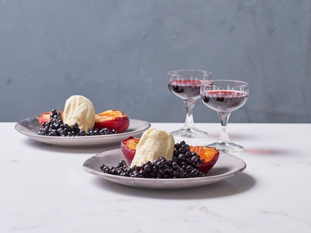 2. Riesling-Eiswürfel und Pfirsich-Eiswürfel (alle oder eine Teilmenge davon) in einem Blender oder Hochleistungsmixer matschig mixen – es nervt anfangs ein bisschen, man muss ein paar Mal den Mixer aufmachen und die Masse zusammenschieben, bis die Messer schließlich richtig greifen. Wahrscheinlich wäre es hilfreich, einfach nur 600 ml Riesling einzufrieren und die letzten 100 ml flüssig mit in den Mixer zu geben – das habe aber ich noch nicht probiert. Auf jeden Fall gleich zu Beginn auch Holunderblütensirup und Rum zugeben und so die Masse zart abschmecken. In kalte Gläser verteilen und mit Pfirsichstücken garnieren.