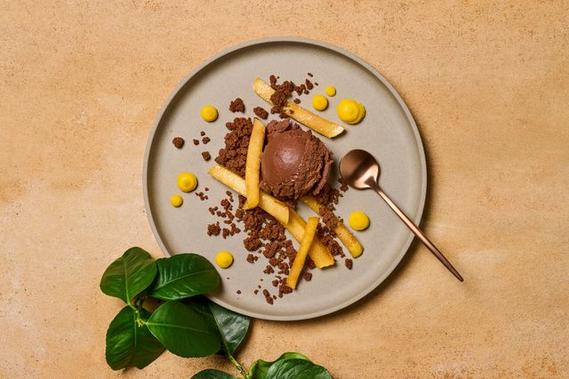4. Etwas Crumble auf Teller verteilen, Quitte und Schokoeis auf dem Crumble anrichten, etwas Orangenschalencreme drumherum tupfen – besonders ordentlich werden die Tupfen mit einer Spritzflasche.